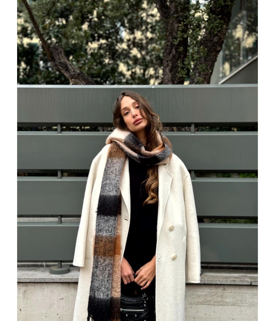 Cappotto modello doppiopetto chiusura bottoni interno foderato spalla scesa taglia unica vestibilità morbida.