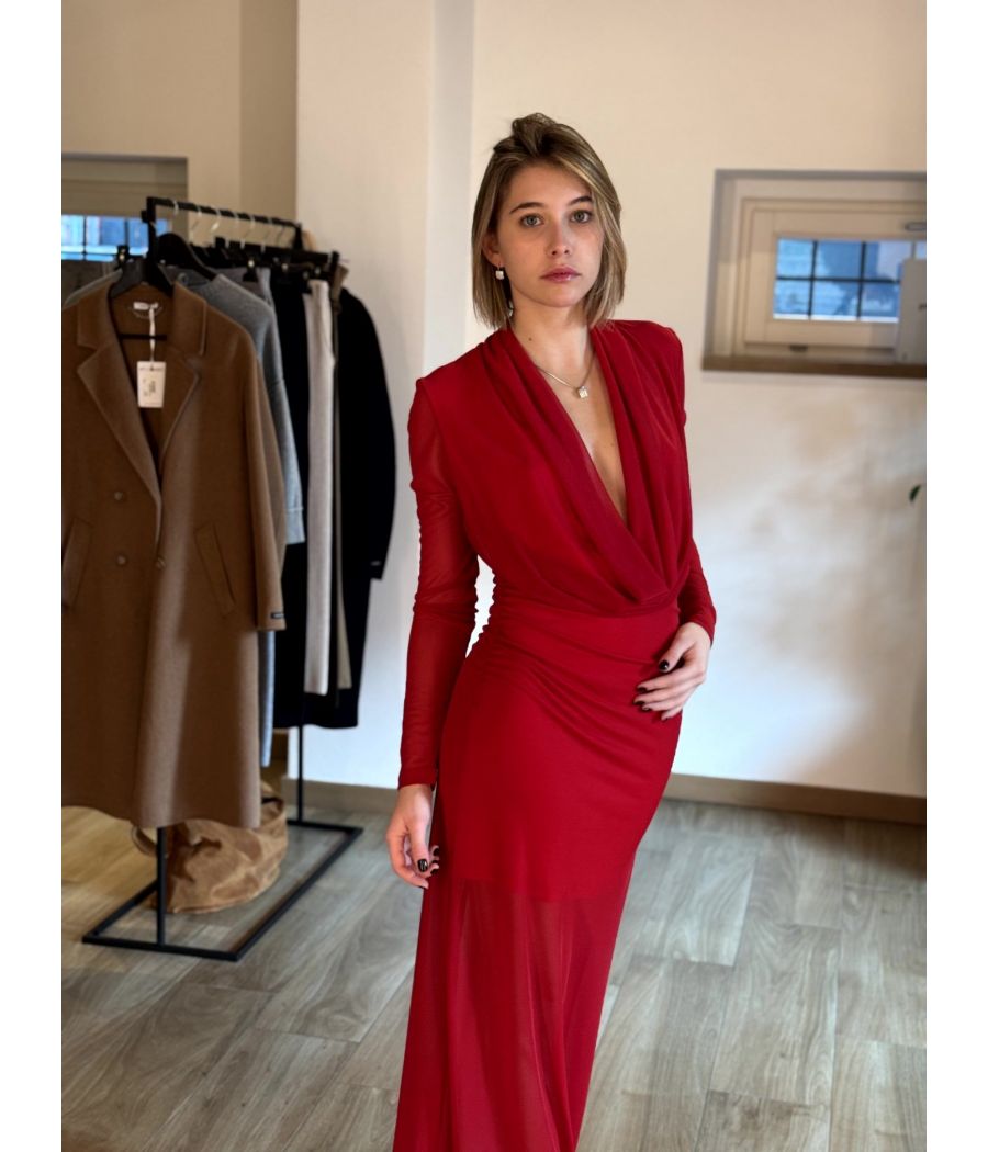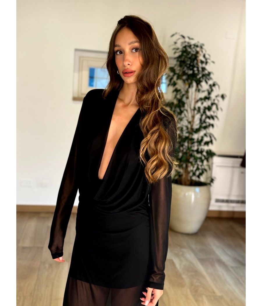 Abito lungo con scollatura morbida profonda, tessuto tulle trasparente da metà gamba con sua fodera interna. Manica lunga elasticizzato.