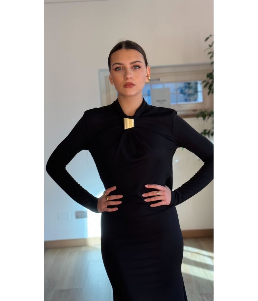 Abito Lungo con dettaglio nodo chic sul davanti, scollatura scollo profondo posteriore aderente gonna effetto sirena, elasticizzato disponibile nero.
